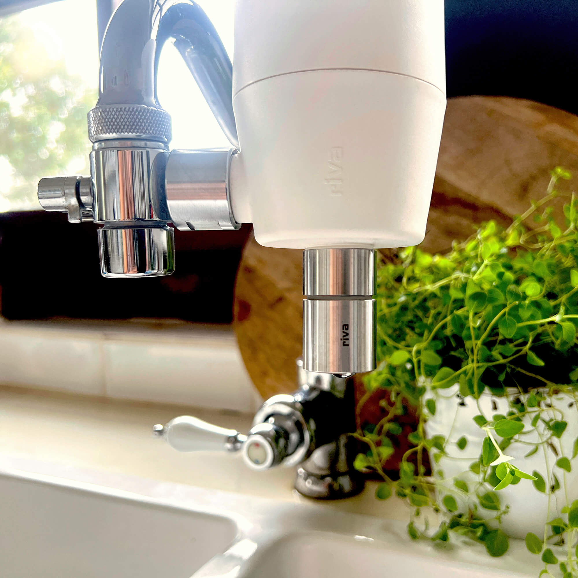 Der riva ENYA kann problemlos mit dem Wasserhahnfilter rivaALVA-S genutzt werden. Dazu wird einfach der vorhandene Auslauf / Perlator vom Wasserfilter abgeschraubt und der riva ENYA aufgedreht, fertig.